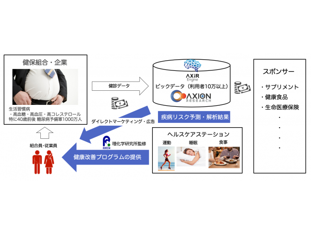 弊社では主に癌、生活習慣病、ストレスからくる鬱病、アルツハイマー型認知症などのビックデータ解析を行っており、これらのデータを保有する機関、また特に検診データ保有の多い健康保険組合などからの検診データを解析することにより、主に医療負担の大きい生活習慣病の未病状態を把握し、理化学研究所と弊社とで推進する「健康改善プログラム」をご提供し、病化の悪化傾向を阻止し、健康状態に戻す取り組みを行っております。