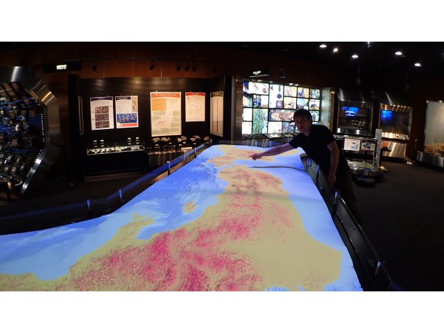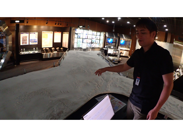 精密な地形模型に地質・化石などの学術データをプロジェクションマッピング