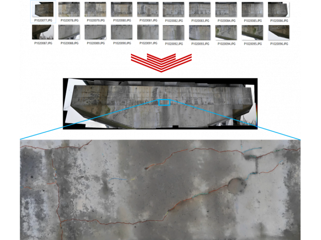 ●分割撮影した多数の画像をパノラマ合成し、ひび割れ検出結果を重畳表示できます