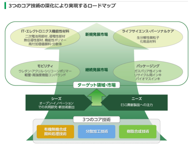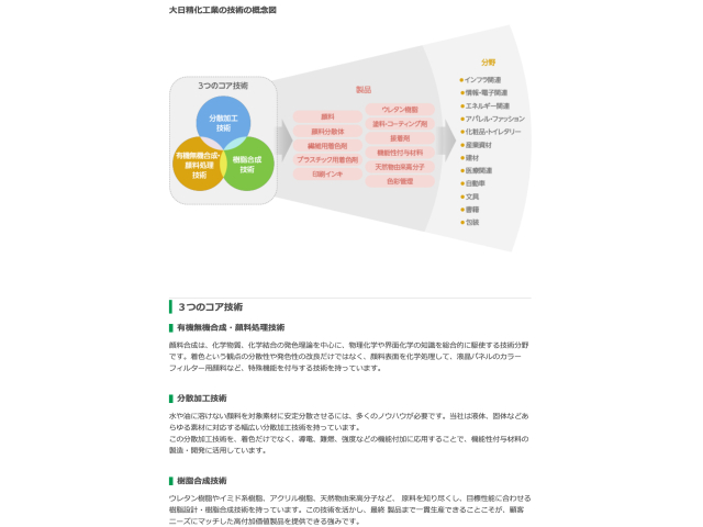 当社の研究開発部門において3つのコア技術「有機無機合成・顔料処理技術」「分散加工技術」「樹脂合成技術」をもとに、「新事業創出」の為のキーとなる新たな素材・要素技術の探索と研究を進めています。