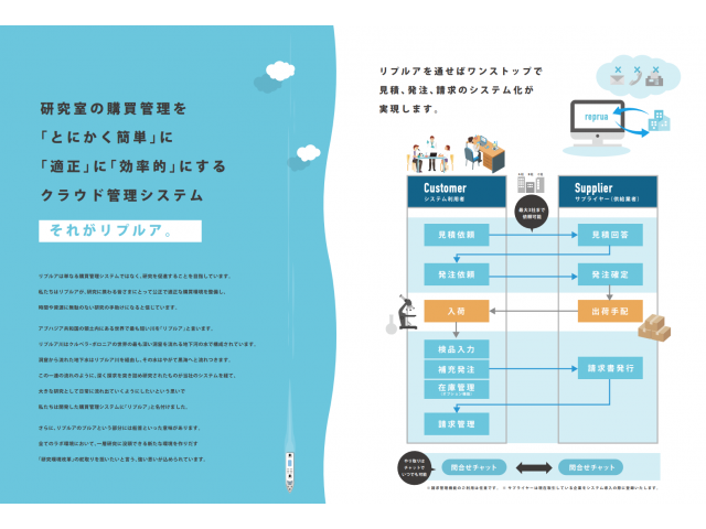 研究業務における煩雑な購買・購買管理・在庫管理業務をワンストップで解決できるクラウドシステム「リプルア」で研究者が研究に没頭できる世界を目指しています。